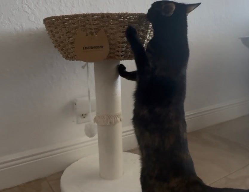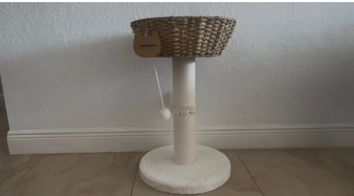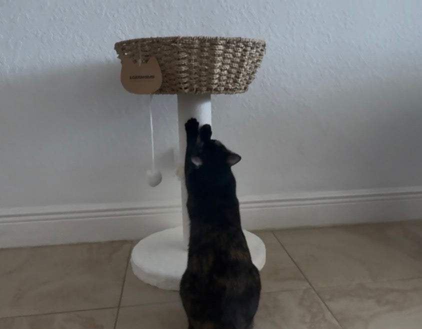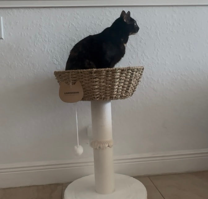 Designed for scratching, climbing, and lounging, this compact cat tree features a handwoven seagrass structure, a cozy nest-style basket bed, and a top perch with dual-sided cushion comfort. A cotton rope scratching post supports healthy claw maintenance, while the hanging toy ball adds playful enrichment.