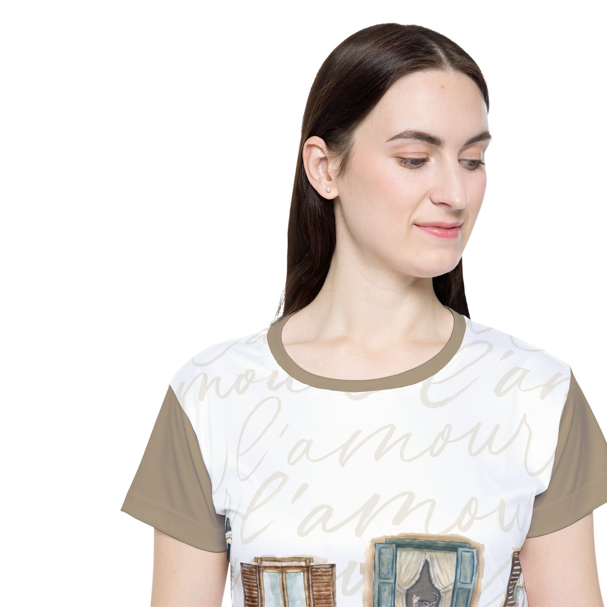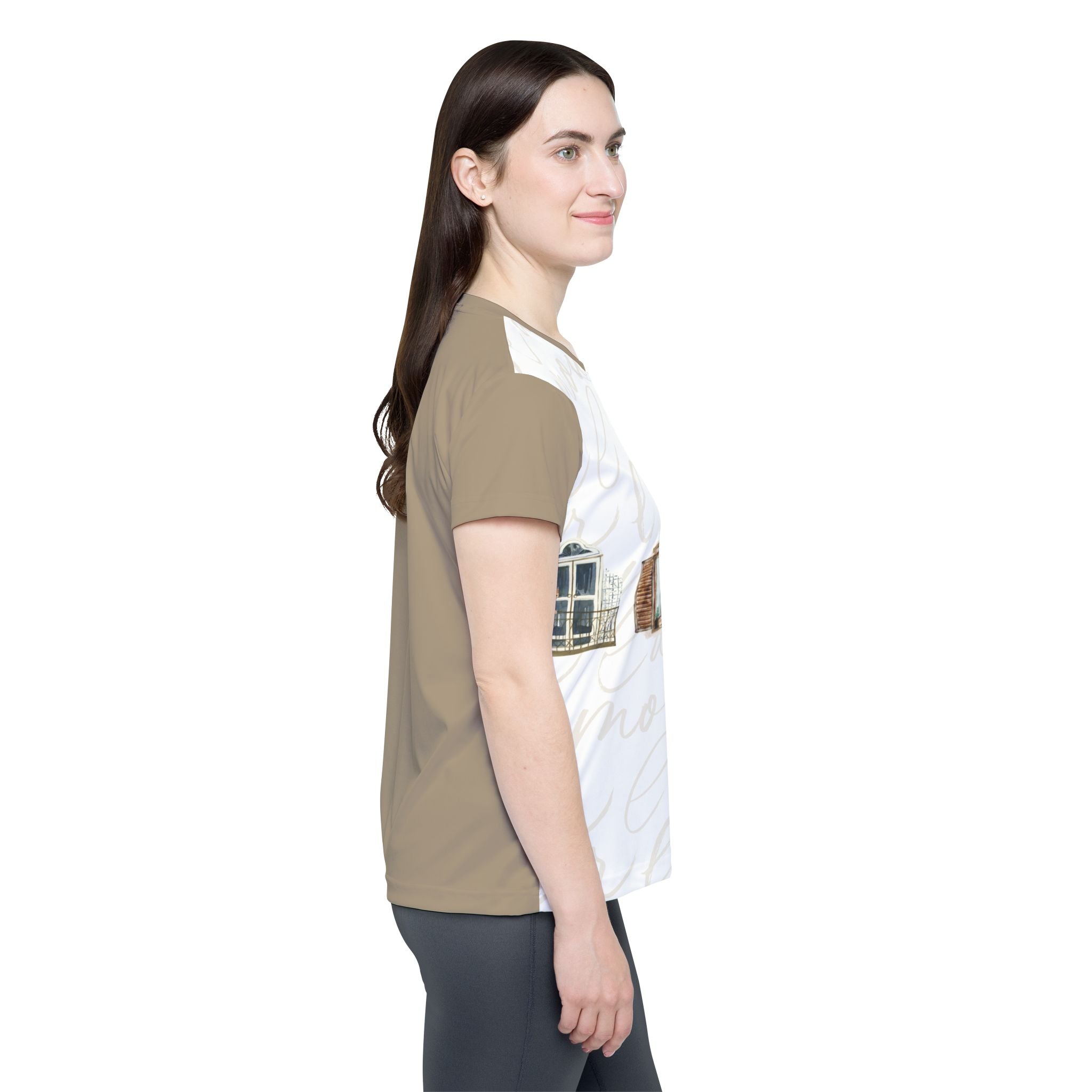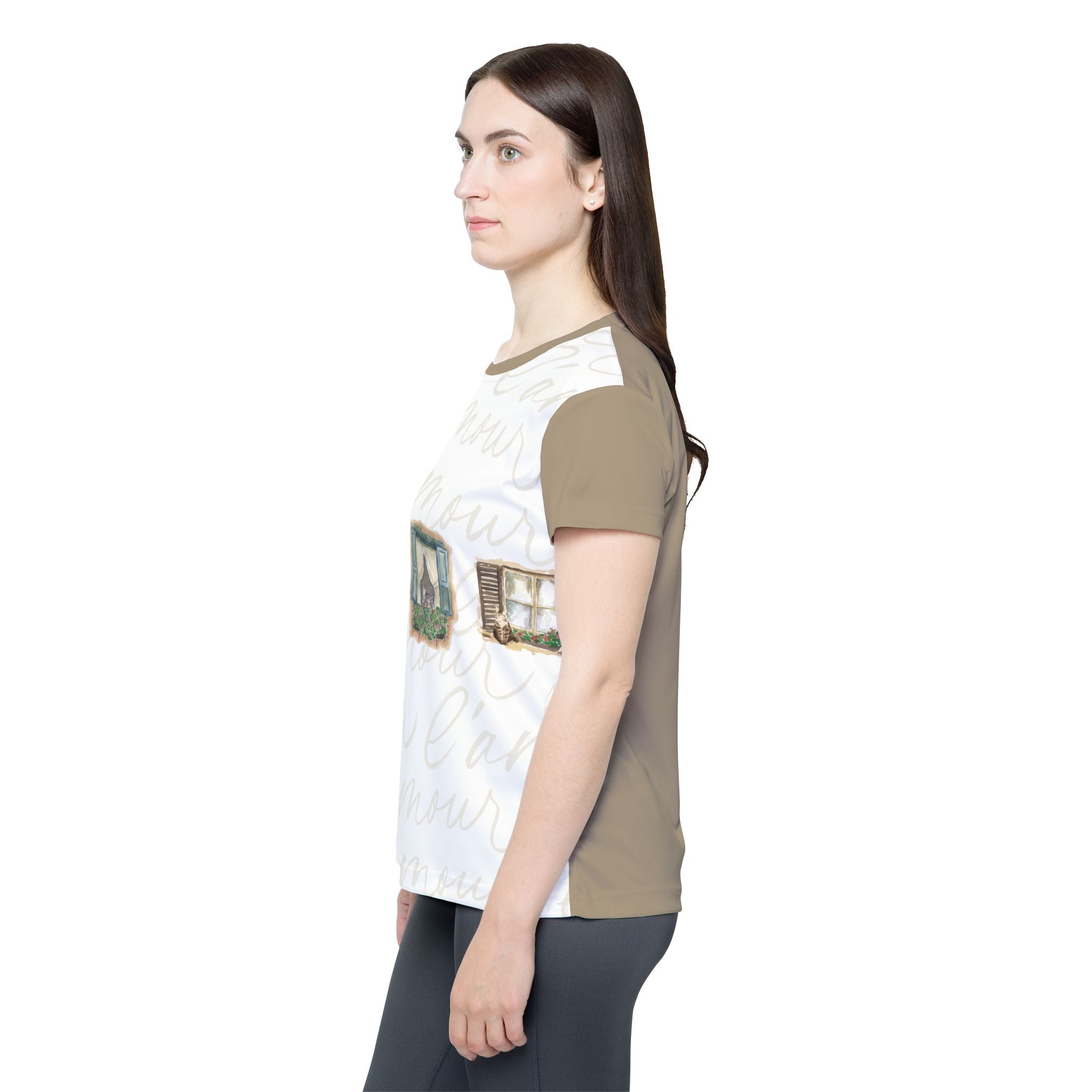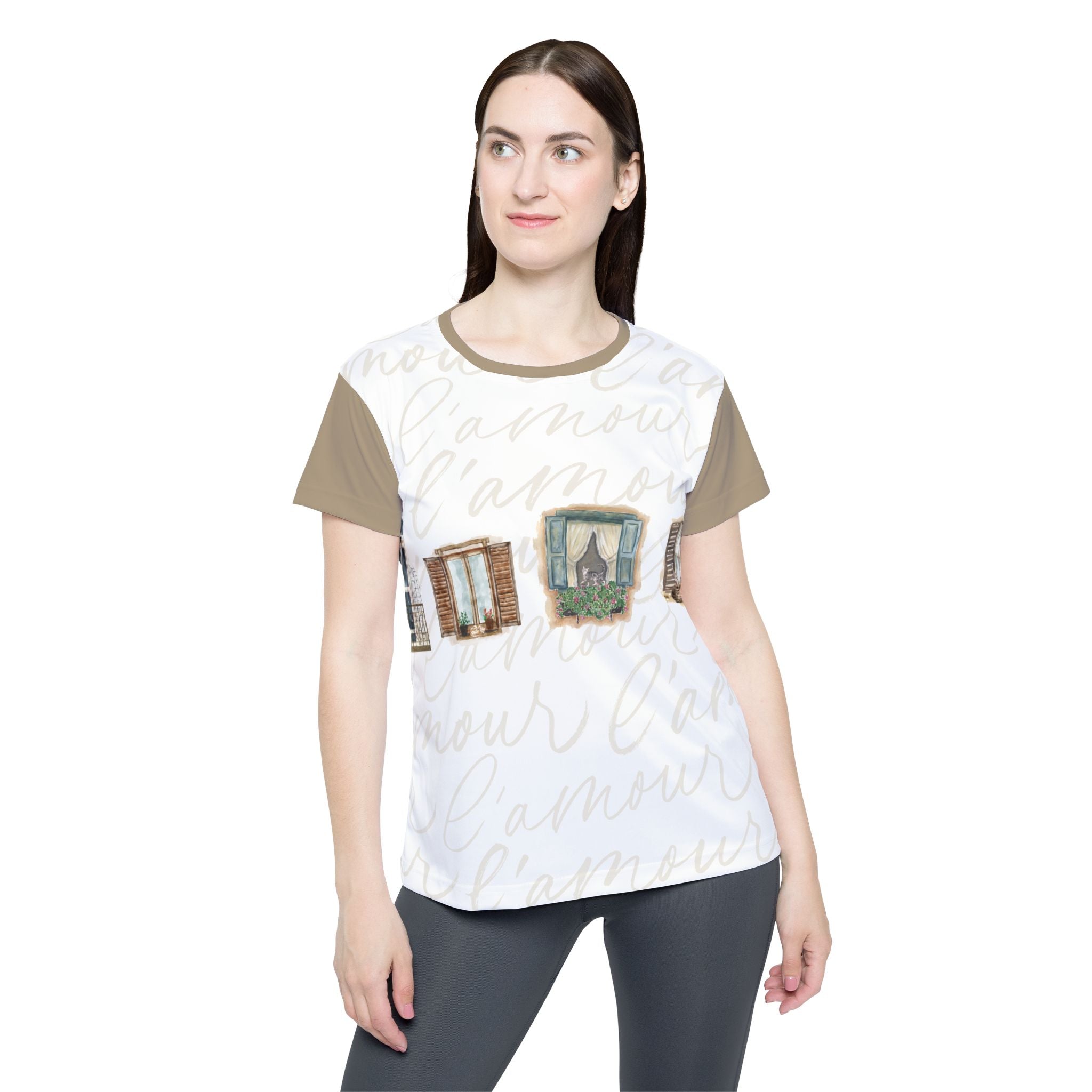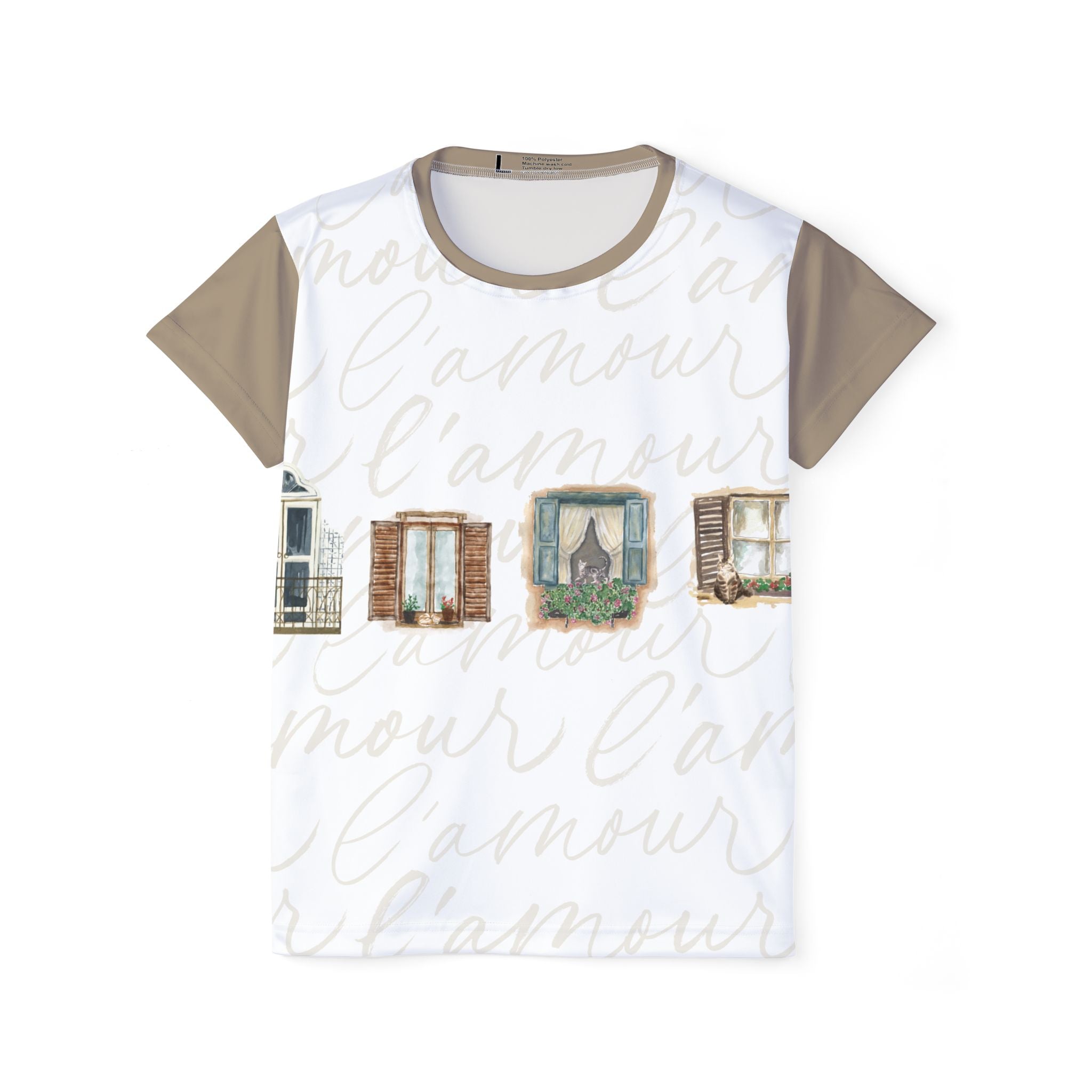 Faded window frames and timeworn shutters drift across a soft backdrop of handwritten l’amour, creating a wearable scene that feels like a memory of slow mornings and sun-washed balconies. Muted khaki sleeves and back add balance and versatility, making it easy to style whether you’re heading out for a walk, meeting friends for coffee, or moving through your workout.